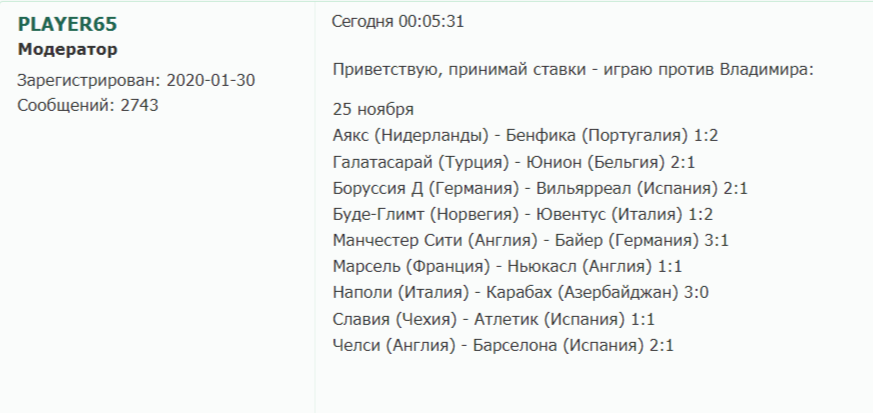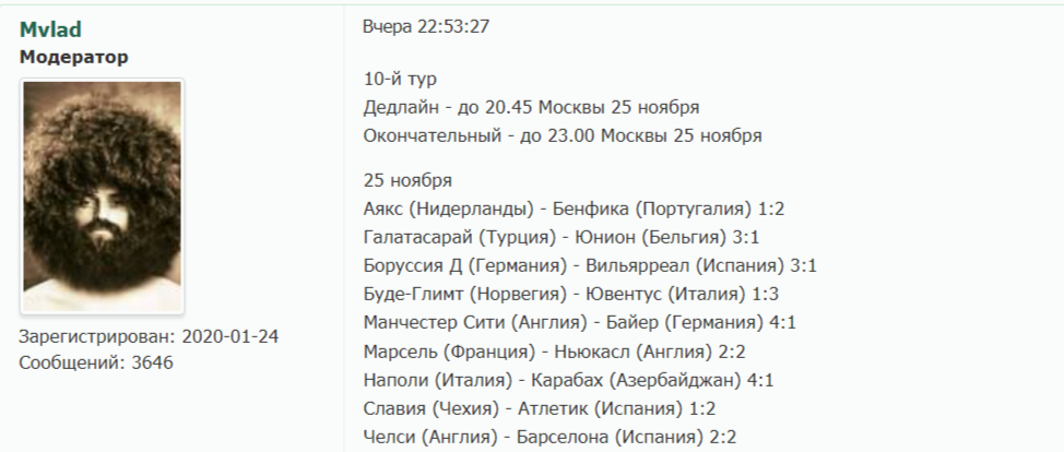 Каждый участник должен до начала тура оставить прогнозы в данной теме или выслать их личным сообщением кому-либо из организаторов (Mvlad, PLAYER65) - время начала тура (дедлайн) определяется временем начала первого матча из программы прогнозирования. Прогнозы принимаются до начала 3-го матча тура (кроме 2 тура и 2-х матчей финала - см. программную сетку), но возможно взятие пустых ворот при верных ставках соперника на исходы пропущенных матчей!